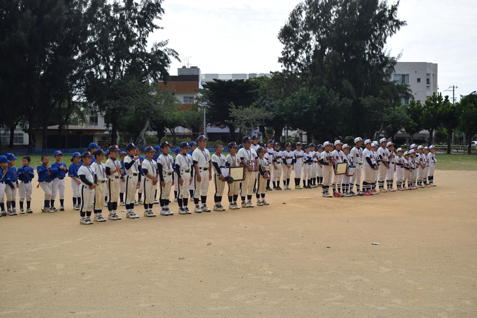 決勝戦はこれまでの天気と打って変わって、強い日差しが昇り、決勝戦にふさわしい天候になりました。試合は、小刻みに点を重ねた識名ブルーファイターズがオール上間の終盤の猛攻を振り切り、見事に優勝を飾りました