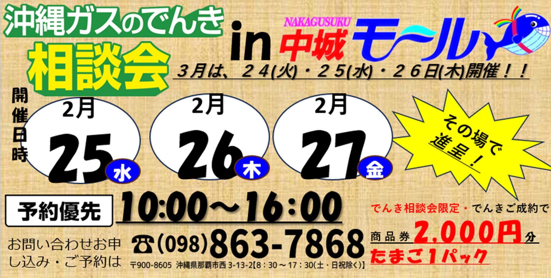 お問い合わせ、ご予約は、098-863-7868 まで。